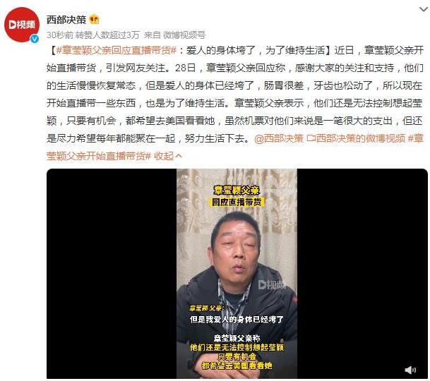 【章莹颖父亲回应直播带货】 【章莹颖父亲回应直播带货:爱人的身体垮了,为了维持生活】近日,章莹颖父亲开始直播带货,引发网友关注。28日,章莹颖父亲回应称,感谢大家的关注和支持,他们的生活慢慢恢复常态,但是爱人的身体已经垮了,肠胃很差,牙齿也松动了,所以现在开始直播带一些东西,也是为了维持生活。