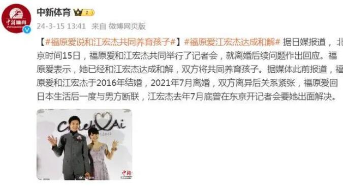 【福原爱宣布与江宏杰达成和解】据日媒报道, 北京时间15日,福原爱和江宏杰共同举行了记者会,就离婚后续问题作出回应。福原爱表示,她已经和江宏杰达成和解,双方将共同养育孩子。据媒体此前报道,福原爱和江宏杰于2016年结婚,2021年7月离婚,双方离异后关系紧张,福原爱回日本生活后一度与男方断联,江宏杰去年7月底曾在东京开记者会要她出面解决。