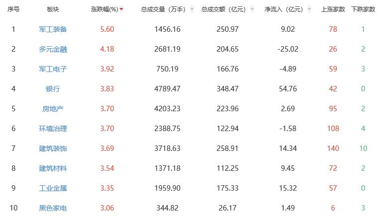 板块方面,军工装备、多元金融、军工电子、银行、房地产等涨幅居前。