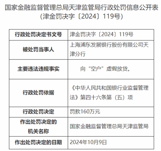 中国经济网北京10月21日讯 国家金融监督管理总局网站10月16日发布的行政处罚信息公开表(津金罚决字〔2024〕119号)显示,上海浦东发展银行股份有限公司天津分行存在向“空户”虚假放贷的违法违规事实。根据《中华人民共和国银行业监督管理法》第四十六条第(五)项,国家金融监督管理总局天津监管局对其罚款160万元。