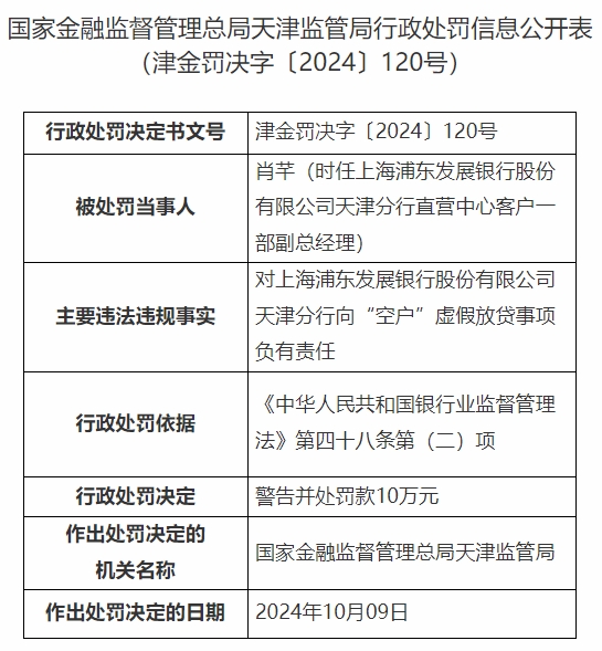 同时发布的行政处罚信息公开表(津金罚决字〔2024〕120号)显示,肖芊(时任上海浦东发展银行股份有限公司天津分行直营中心客户一部副总经理)对该分行向“空户”虚假放贷事项负有责任。根据《中华人民共和国银行业监督管理法》第四十八条第(二)项,国家金融监督管理总局天津监管局对其警告并处罚款10万元。