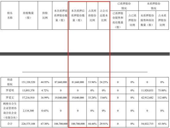快意电梯2024年5月25日披露的控股股东部分质押股份解除质押以及部分质押股份延期购回的公告显示,快意股权持股数量为151,330,520股,占公司总股本比例的44.95%;快意股权本次质押后质押股份数量为81,660,000股,占其所持股份比例的53.96%,占公司总股本比例的24.25%。罗爱文持股数量为57,216,910股,占公司总股本比例的16.99%;罗爱文本次质押后质押股份数量为19,040,000股,占其所持股份比例的33.28%,占公司总股本比例的5.66%。罗爱文及其一致行动人合计持股数量为226,575,108股,持股比例为67.30%;本次质押后合计质押股份数量为100,700,000股,占其所持股份比例的44.44%,占公司总股本比例的29.91%。