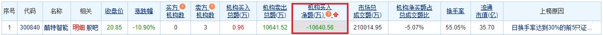 龙虎榜数据显示,酷特智能卖出金额最大的前五名中,有3家机构专用席位。经统计,酷特智能的机构席位今日净卖出金额为10640.56万元。
