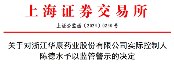 中国经济网北京11月21日讯 昨日,上交所下发《关于对浙江华康药业股份有限公司实际控制人陈德水予以监管警示的决定》(上证公监函〔2024〕0250号)。