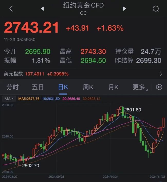 22日夜盘,纽约黄金大涨1.63%,收盘报2743.21美元/盎司。近一周时间,累计涨幅接近7%,完全“收复”上周跌幅。