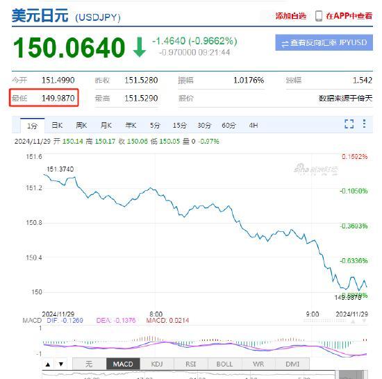 美元兑日元USD/JPY回落至150下方,这是自10月21日以来的首次。
