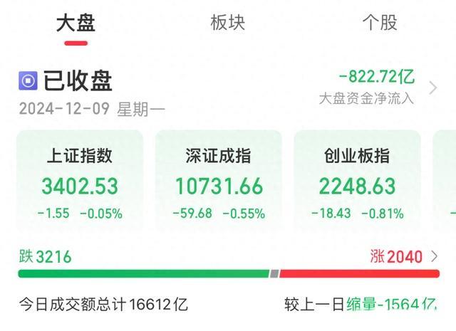 12月9日,A股三大指数集体收跌。沪指跌0.05%,深成指跌0.55%,创业板指跌0.81%,北证50指数跌4.31%。全市场成交16612亿元,较上个交易日缩量1564亿元,超过3200只个股下跌。人形机器人板块、PEEK材料板块、贵金属板块表现活跃。