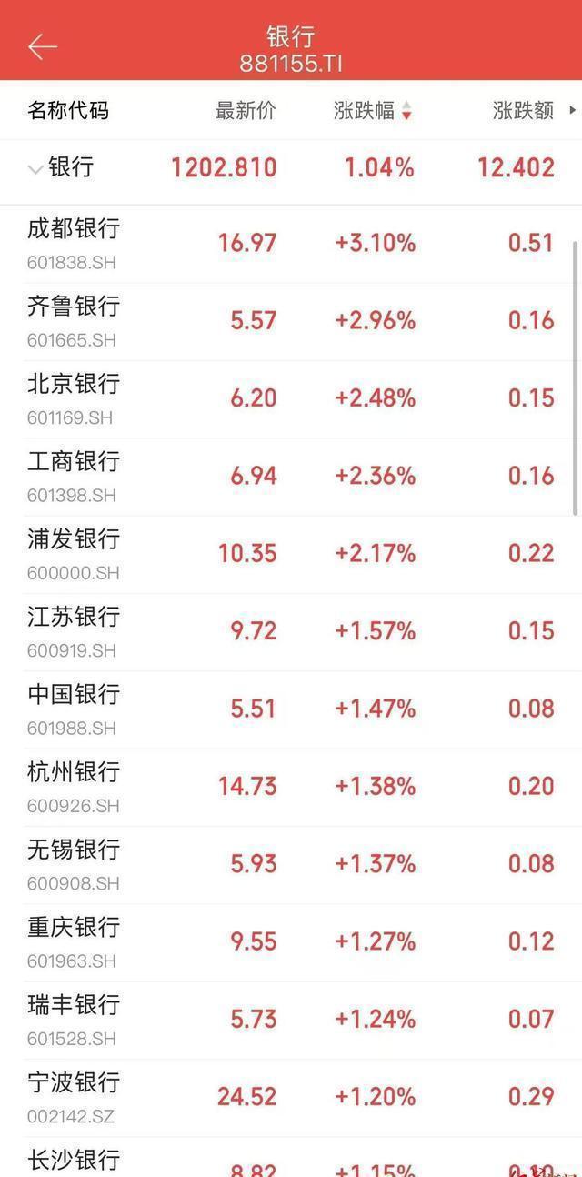 四大行中,工商银行盘中一度涨超3%,最终收涨2.36%,每股报6.94元。农业银行、中国银行、建设银行分别上涨1.14%、1.47%、1.14%,创近6年来新高。中小银行如成都银行、齐鲁银行等多只个股涨幅超过2%,江苏银行、宁波银行等十余只股票涨幅超过1%。