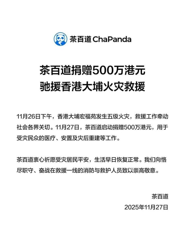 起源于成都的茶饮品牌茶百道也在11月27日捐赠500万港元,资金将定向用于受灾民众的医疗救助与生活秩序恢复工作。这些企业的快速行动成为内地企业支援香港救灾的重要组成部分。截至11月29日发稿前,涵盖科技、电商、物流等多个行业的内地企业及机构对香港大埔火灾的捐款总额已超过6亿港元,大量生活及应急物资正在源源不断集结驰送香港。