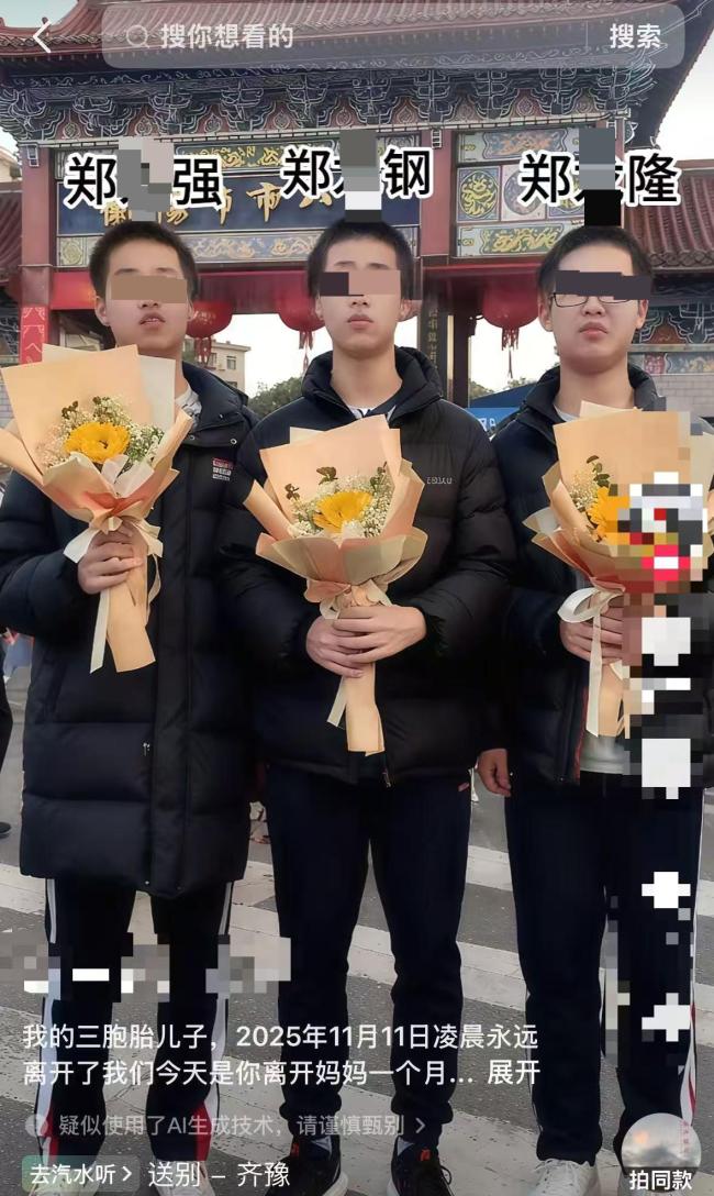 在该平台搜索框输入“三胞胎离世”等关键词后,会出现许多类似的图文内容。这些图片中多为三名长相相似、身穿校服或休闲装的青少年,姓名中常含“龙”“麒”“麟”等字。这些内容多为单一图片,常配以《送别》音乐及统一文案,如“我的三胞胎儿子(女儿或孩子),2025年某月某日凌晨永远离开了我们,今天是你离开妈妈一个月了……”。奇怪的是,有些图片中仅有两名青少年,但配文仍是“我的三胞胎孩子”。