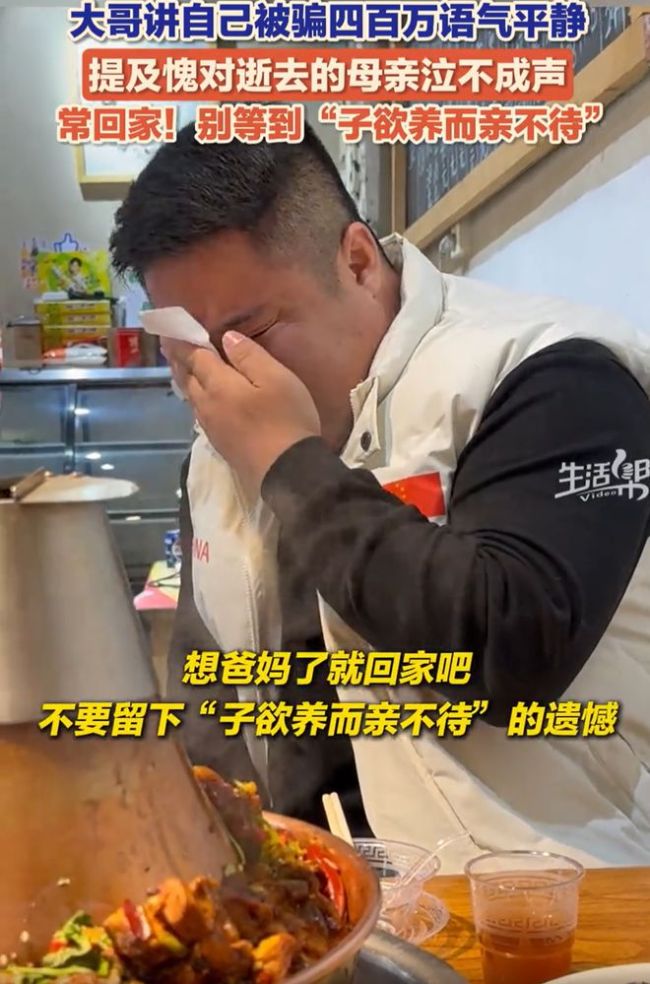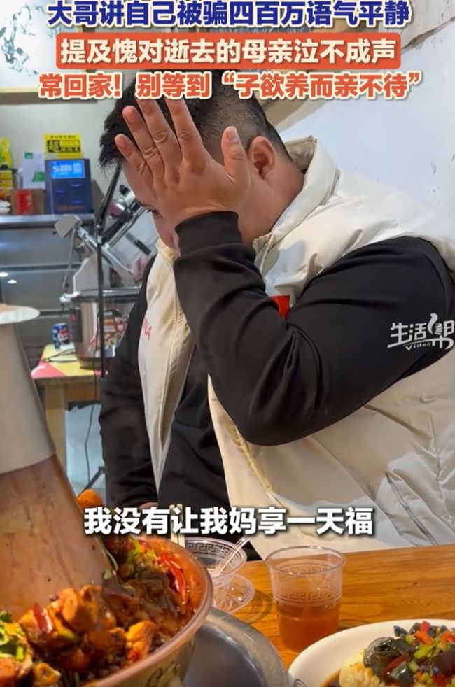 男子提及愧对逝去的母亲泣不成声 子欲养而亲不待!在山东济南,一名男子与朋友吃饭时聊起了自己的经历。他曾因工程被骗400万元,原本讲述这段经历时还能保持平静,但一提到去世的母亲,他突然泣不成声。他认为自己最大的遗憾是没有让母亲享福。