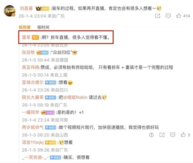 在评论区,有人建议直播“装车”,雷军对此感到意外,称之前的拆车直播许多人反馈看不懂。