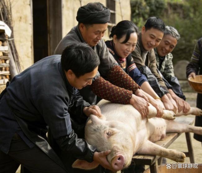 这场“按年猪”的活动唤醒了人们对传统年味儿的怀念。杀年猪、吃刨猪汤是川渝及南方多地的古老习俗,源于《礼记·月令》中的“腊祭”,承载着丰收感恩和邻里团聚的情感。随着城市化进程加快,越来越多的人远离乡村农耕生活,超市里的冷鲜肉取代了现杀的年猪,程式化的年夜饭少了邻里互助的热闹,年味儿渐渐变成了手机里的祝福短信。而呆呆家的这场盛宴,恰好打开了一扇记忆之门:烫猪、煺毛、解肉的传统工序,热气腾腾的刨猪汤,甚至按猪时的吆喝声,都精准复刻了旧时光里的过年场景,让网友们在参与中完成了一次“精神还乡”。