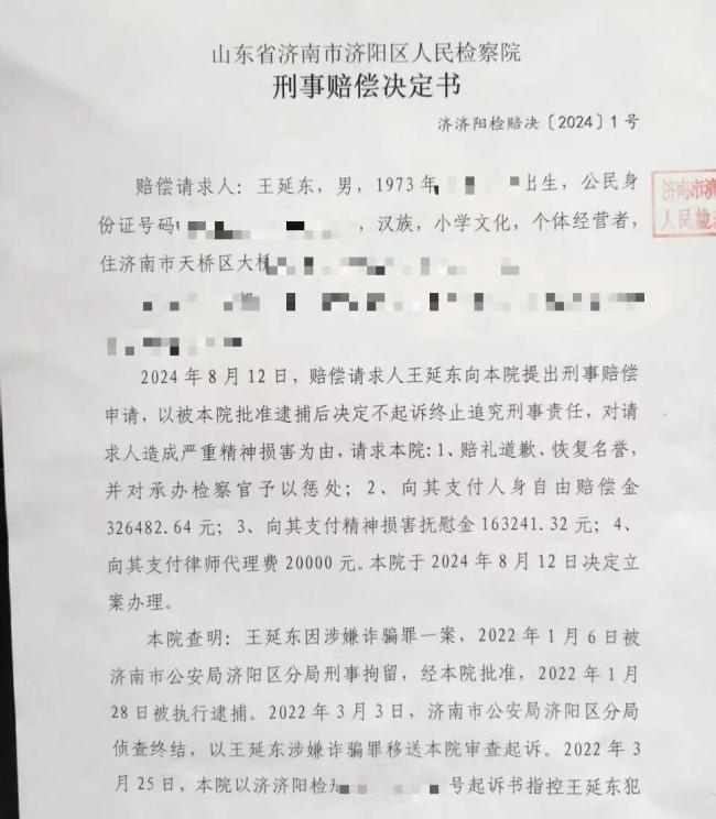 此后,王延东申请国家赔偿,并要求崔寨街道办事处征地拆迁领导小组返还涉案拆迁款及利息共205.8万元及因被羁押而损失的115万元。2024年10月11日,济阳区人民检察院出具《刑事赔偿决定书》,王延东获得人身自由赔偿金326945.08元、精神损害抚慰金163000元,合计489945.08元,并在夫妻二人住所地发布相关信息为其恢复名誉并赔礼道歉;其他赔偿请求不予支持。王延东妻子的文书一致,夫妻二人共计应获979890.16元。
