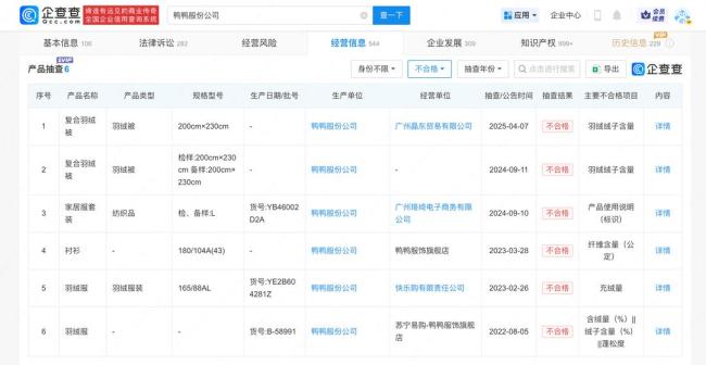 企查查APP显示,鸭鸭羽绒服关联公司鸭鸭股份公司成立于2000年5月,法定代表人为樊继波,注册资本1.05亿人民币。该公司曾多次因侵害商标权纠纷发起诉讼。此外,其多个产品曾被抽查不合格,包括羽绒被、羽绒服装等。