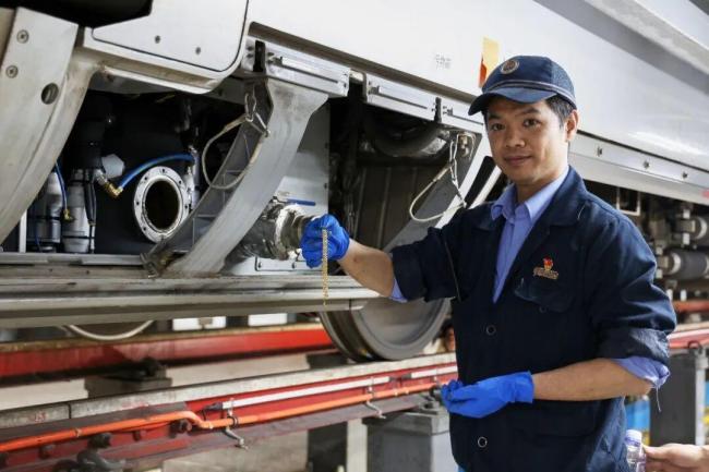 当晚8时28分,该趟复兴号动车组驶入南宁动车所检查库,地勤机械师严芝科和搭档张浩已准备好工具材料等候在一旁。他们表示当晚检修任务量达50组,是南宁动车所有史以来最高纪录。通过研判,确定金手链位于集便器真空中转箱内。