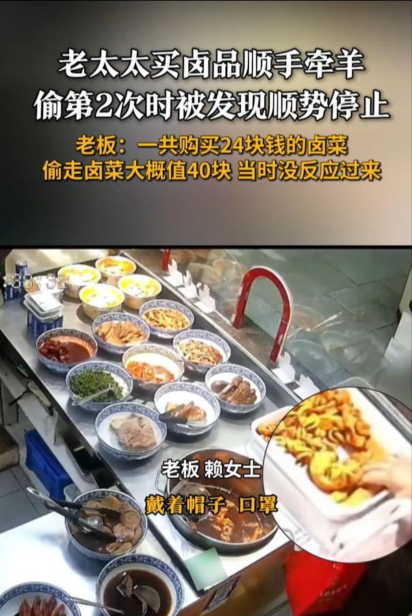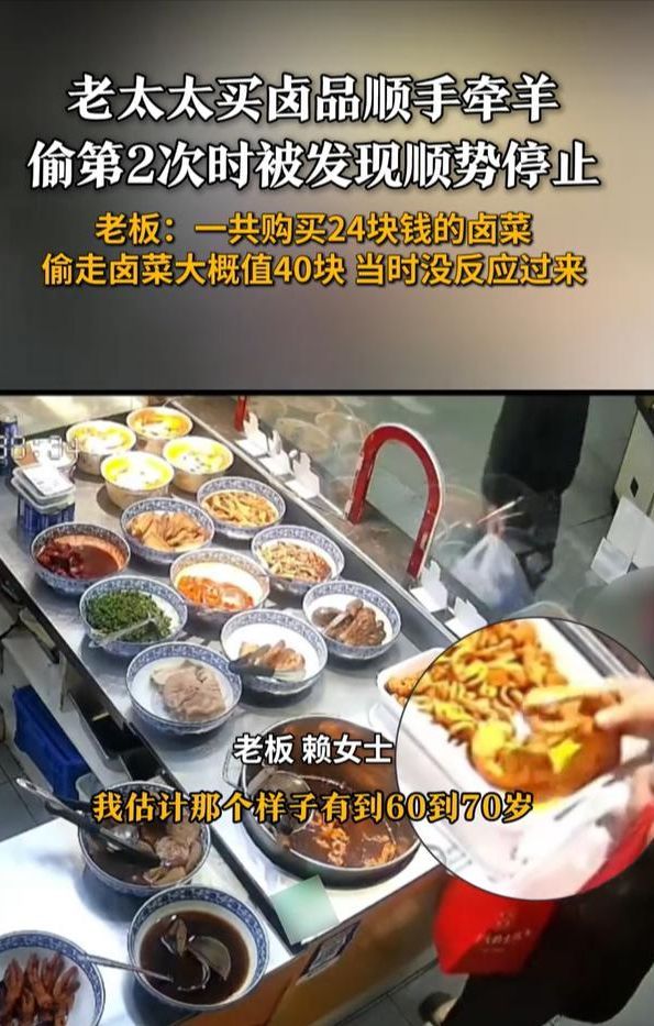老人买卤菜顺走40元大肠头 贪小便宜丢人品!在无锡的一家卤味店,店主赖女士遇到了一件让她意想不到的事情。一位六七十岁的老人在店里点了价值24元的卤菜,看似与普通顾客无异。然而,在赖女士转身盛菜时,老人却悄悄地将柜台里的大肠头拿走。更令人惊讶的是,她不仅没有收敛,反而趁机进行了第二次偷窃。