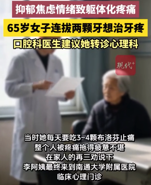 65岁的李阿姨(化姓)突然牙疼,拔了两颗牙后疼痛丝毫未减。为此,她一天要吃三四颗止痛药。正当她一心想拔第三颗牙时,某院口腔科医生建议她转诊心理科。她来到南通大学附属医院就诊,检查发现她的确存在明显焦虑、抑郁情绪,长期积累的压力转化为牙痛症状。据了解,在服用抗抑郁药物后,她的牙痛症状得以缓解。