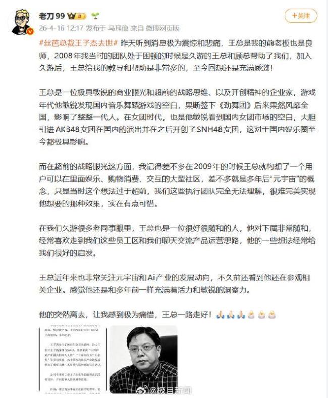对于00后来说,王子杰这个名字可能有些陌生,但提到《劲舞团》和SNH48,80后和90后一定印象深刻。久游前员工@老刀99的悼念文中,透露了这位行业大佬不为人知的一面:原来传说中的“偶像教父”是个随和到没架子的暖心老板。
