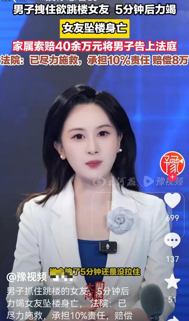 4月17日,黑龙江牡丹江市的渠某因未能妥善照顾女友,被判赔偿8万余元,并承担女友跳楼死亡10%的责任。女友跳楼前,渠某未能安抚好她的情绪。尽管渠某试图抓住女友并坚持了5分钟,但最终因体力不支未能阻止悲剧发生。