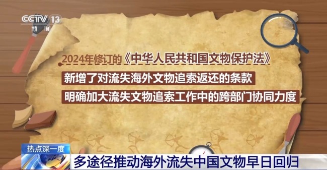 近年来,多批次国宝陆续回归祖国。例如,2020年9月,国家文物局成功叫停日本拍卖公司拟拍卖的一尊“唐天龙山石雕佛头”,使其回归祖国。同年年底,爱国企业家捐赠的圆明园马首铜像也正式划拨入藏。2024年初,国家文物局从美国追索回被盗流失的西周丰邢叔簋。同年11月,意大利查获并返还56件中国文物艺术品。2025年5月,美国返还了子弹库帛书第二卷《五行令》和第三卷《攻守占》,结束了这些珍贵文物长达79年的海外漂泊历程。