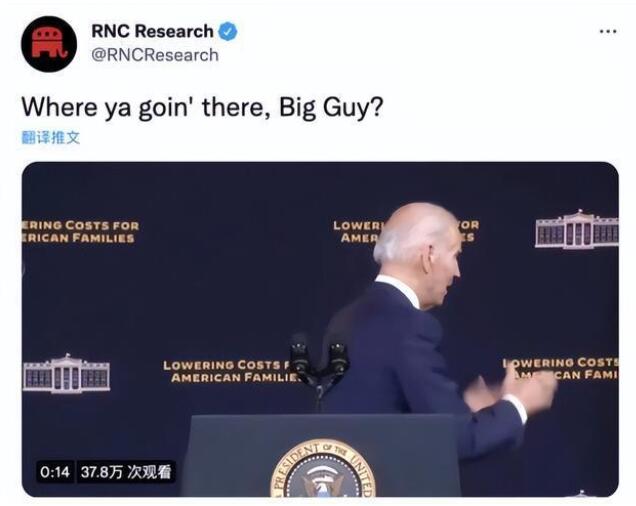 在社交媒体平台上,有外媒和网友也注意到了这一幕,“想象中的朋友:拜登似乎再次想要握手,却只对着空气”——俄罗斯卫星网以此为题,描述了现场发生的画面。美国共和党全国委员会也将这一幕上传其旗下运营的推特账号“RNC Research”上,并配文称“你要去哪儿呀,大家伙”↓
