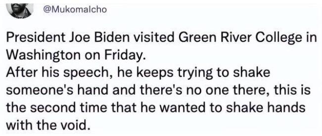 “周五,拜登总统参观了绿河学院。他在演讲后一直想和谁握手,却没有人在那,这是他第二次想和空气握手了。”