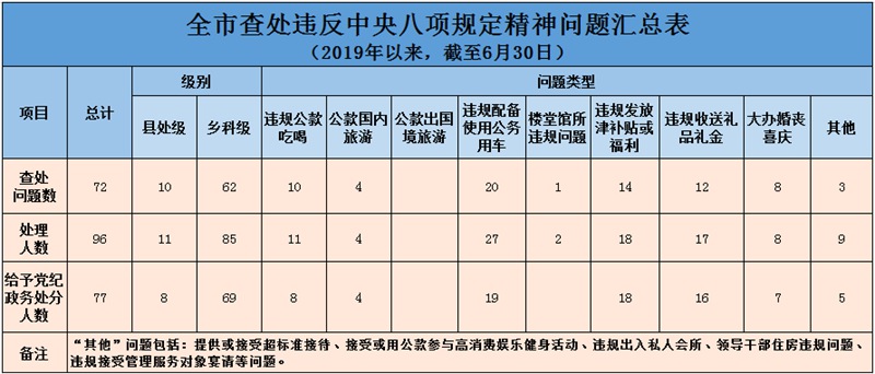 今年以来,郑州市共组织开展监督检查4批次,查处违反中央八项规定精神问题72起,处理96人,通报17期27起典型问题。